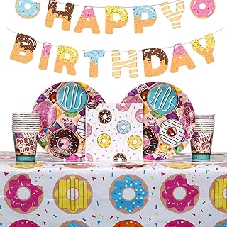 MeiMeiDa Donut-Partyzubehör-Set für 20 Stück, mit Aufschrift „Donut“, „Happy Birthday“, Party-Teller, Servietten, Pappbecher, Tischdecke, Geschirr-Set für Donut-Geburtstags-Party-Dekorationen