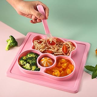 Angzhili Baby Silikon-Platzset mit Löffel, rutschfester Fütterteller für Kleinkinder, Babys Kinder mit starkem Saugnapf, geteiltes Platzset, selbstfütternd, Teller und Schüssel (Pink)