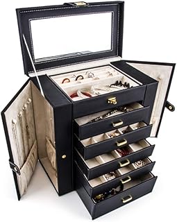 HM&DX Leder Schmuckkästchen Spiegel, Große Kapazität Aufbewahrungsbox Für Schmuck Mit Griff Schubladen Funktionale Schmuckschatulle Für Mädchen Damen-schwarz