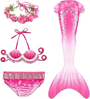 LOBTY 4 Stücke Mädchen Meerjungfrau Schwanz mit Bikini Set Meerjungfrau Badeanzug und Blumengirlande Stirnband, Meerjungfrauenschwanz zum Schwimmen Meerjungfrau Schwimmkostüm für Kinder (keine Flosse)