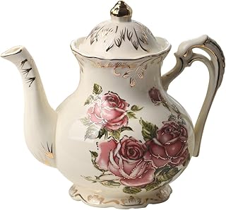 YOLIFE Keramik-Teekanne aus Porzellan, elfenbeinfarben, Vintage-Teekanne mit goldfarbenem Blätterrand (rotes Rosenmuster)