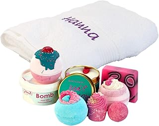 Badebomben Geschenkset groß (Pamper Hamper + Handtuch): Sets aus Badekugeln, Seife und Baumwollhandtuch mit Name, handgemacht, natürliche Inhaltsstoffe - Spa Geschenk für Frauen, Badepralinen