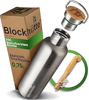 Blockhütte. Premium Edelstahl Trinkflasche isoliert I 750ml I mit Naturborsten Bürste I Isolierflasche auslaufsicher I Wasserflasche spülmaschinenfest für Sport & Freizeit I BPA Frei